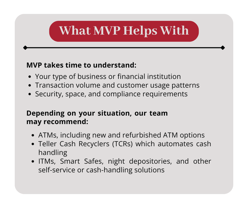 If you’re unsure what type of ATM or cash-handling equipment you need, we’re here to help. One of the biggest benefits of consulting with MVP is getting clear answers to common questions, without needing technical expertise.