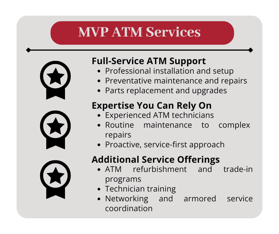 MVP’s experienced ATM technicians are trained to handle everything from routine maintenance to complex repairs. This proactive, service-first approach helps reduce downtime and ensures your equipment remains reliable for customers and staff alike.