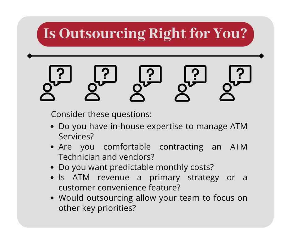 Rather than coordinating multiple vendors or scheduling your own ATM Technician, outsourcing consolidates management under a single experienced partner.