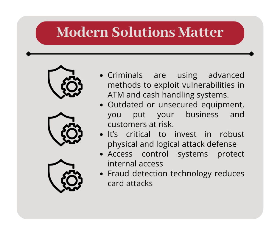 The risks to your cash and data are greater than ever. Criminals are using advanced methods like card skimming, shimming, and ATM jackpotting to exploit vulnerabilities in ATM and cash handling systems. If you rely on outdated or unsecured equipment, you may be unknowingly putting your business and customers at risk.