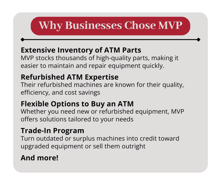 It’s also important to work with a provider that offers comprehensive ATM services. MVP offers solutions for equipment, maintenance, and compliance simplifies operations and reduces long-term costs.