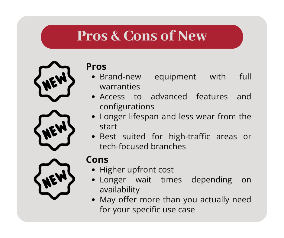 When deciding between a new and a refurbished ATM, it helps to break down the differences in a few key areas: